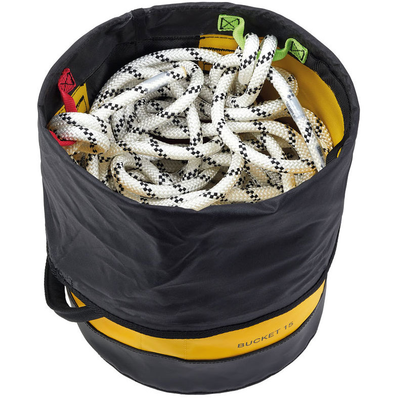 シンプルで耐久性に優れたバッグ BUCKET 15 は、直径 11 mm のロープを 45 メートルまで収納可能です。空の状態でもバッグの形状が直立に保たれるので、用具の出し入れが容易です。小物を入れる外ポケット、収納されている装備を記入したメモを入れるためのクリアウィンドウ付です。素材は TPU のため、激しい使用にも対応します。3種類のカラー: イエロー、レッド、ブラック。