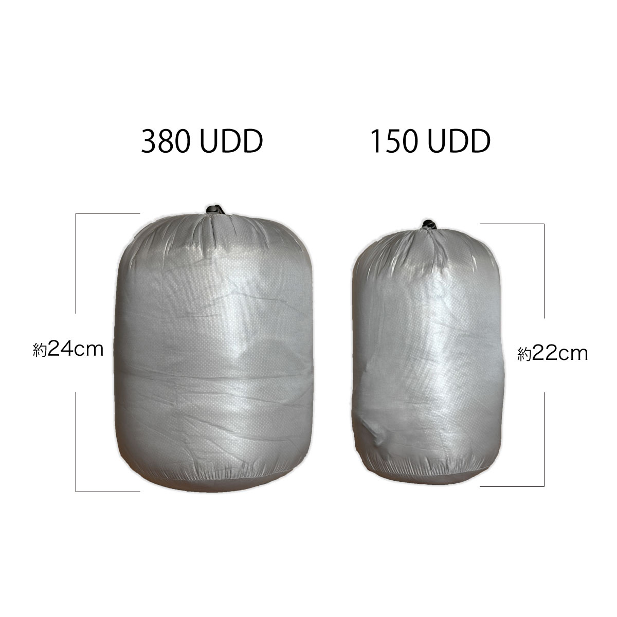 羽毛にはスペイン産ホワイトダックダウンに「湿気を通すが水を吸わない」超撥水加工を施した高機能ダウンUDD(ウルトラドライダウン)を使用。羽毛と撥水剤の樹脂を電子レベルで結合し、細かな粒子の壁を形成することで水分子の侵入を防ぎます。未加工ダウンと比べ反発力が高く、膨らむまでの時間が短いため、冷えた身体を素早く暖められます。