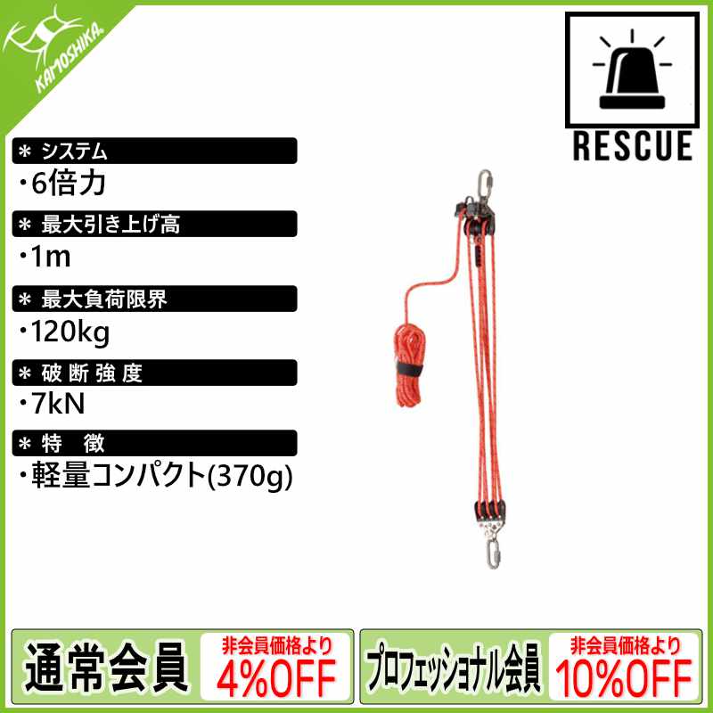 軽量でコンパクトな携帯用緊急ホイストは高所でのレスキューに最適です。6倍力システム。救助者が下降することで、要救助者を少ない力で引き上げることができます。