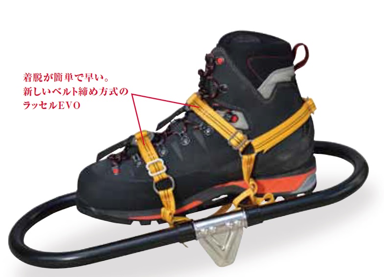 ポリウレタンデッキベルトにより、湿気の多い雪のときでも足下に雪団子がつきにくい。