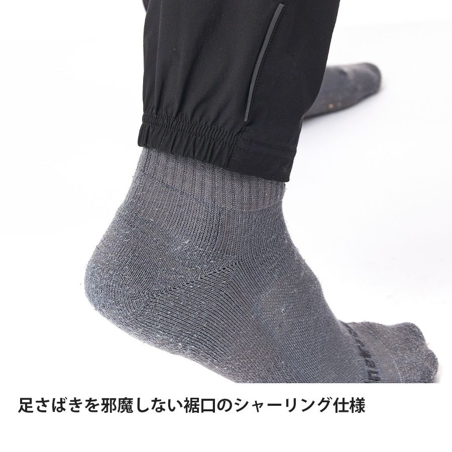 軽さに加えしっかりと防風性を持たせたい臀部や太腿の前面部分には、エバーブレス®エア生地を配置。
