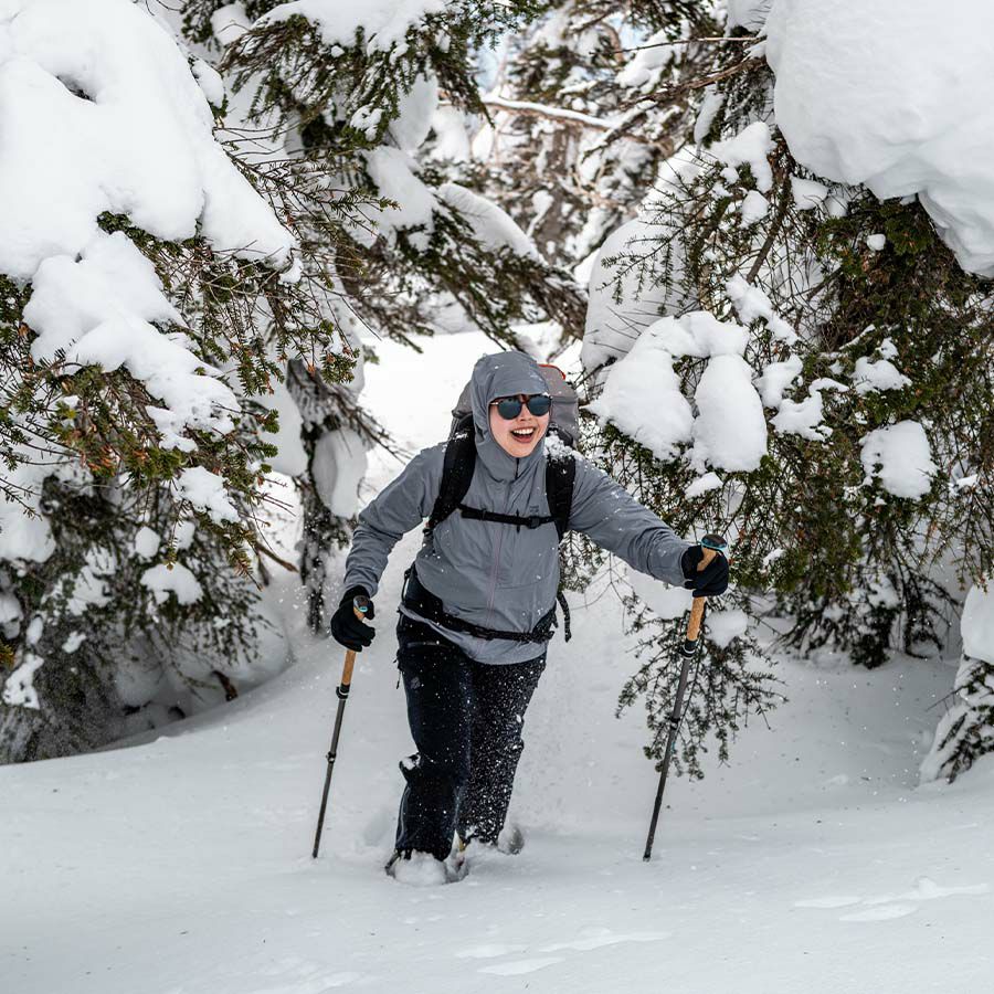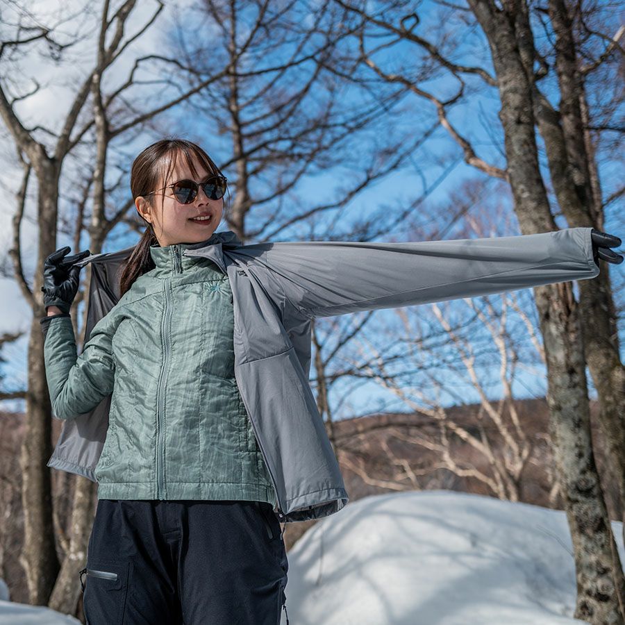 小雨や小雪、強風の中で行動できる耐水性・防風性に加え、際立った蒸れにくさを備えます。