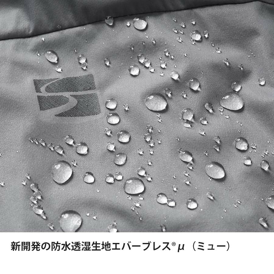 独自開発の防水透湿生地「エバーブレス®μ(ミュー)」は、従来のエバーブレス®メンブレンの約1/3の薄さを誇り、優れた透湿性・速乾性を実現。