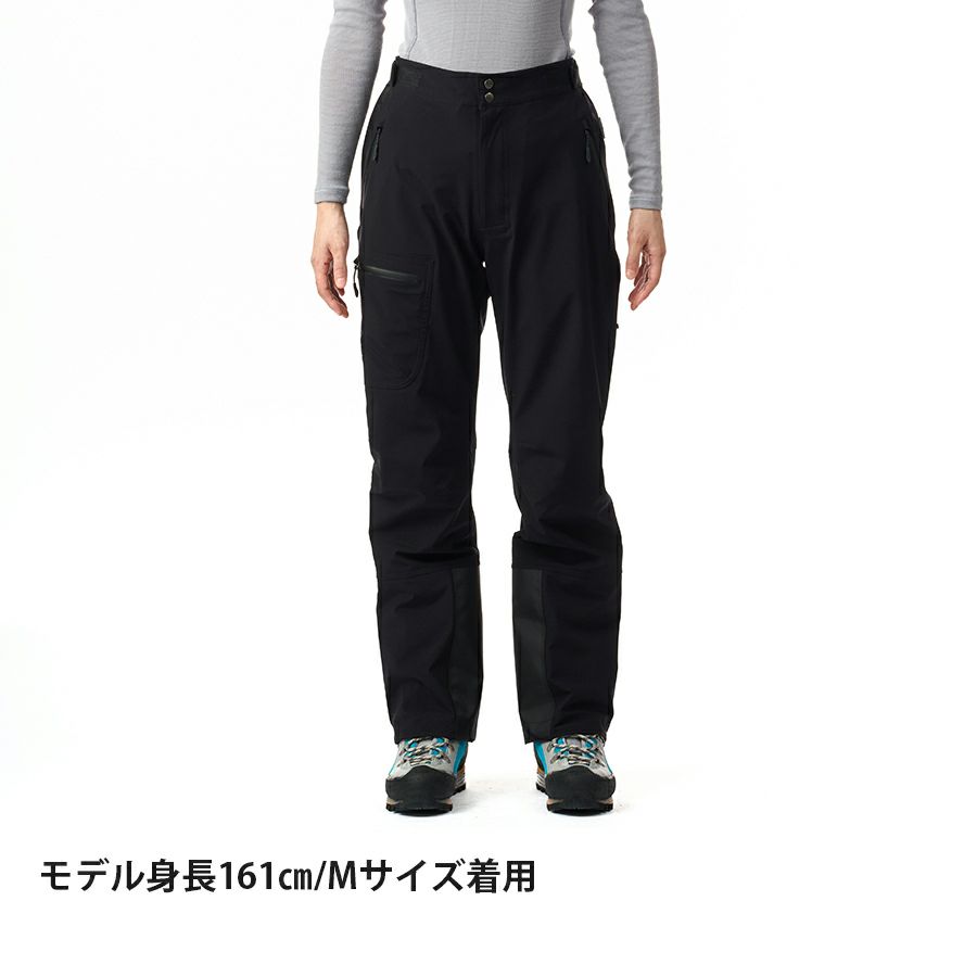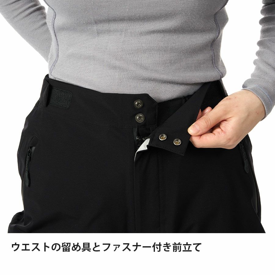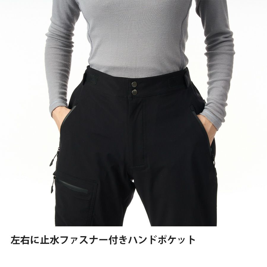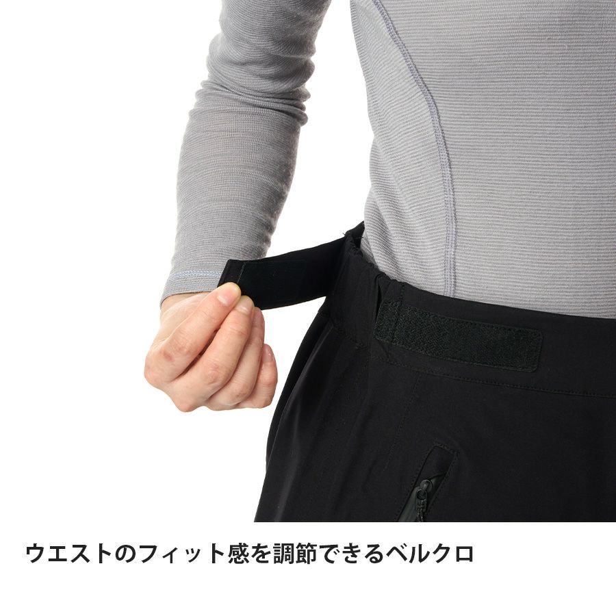 雪山に必要なギミックを各所に過不足なく配置しました。アイゼン使用時の擦れに強いアイゼンガード、グローブを付けたまま調整が容易なウエスト調整機構など、雪山用ハードシェルの基本性能をおさえた造りです。