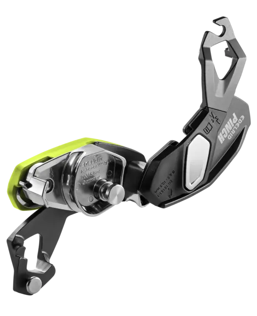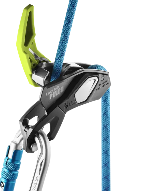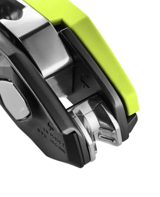 カラビナを使わずダイレクトにハーネスへ装着できる、ブレーキアシスト機能付きのシングルロープ専用ビレイデバイス。